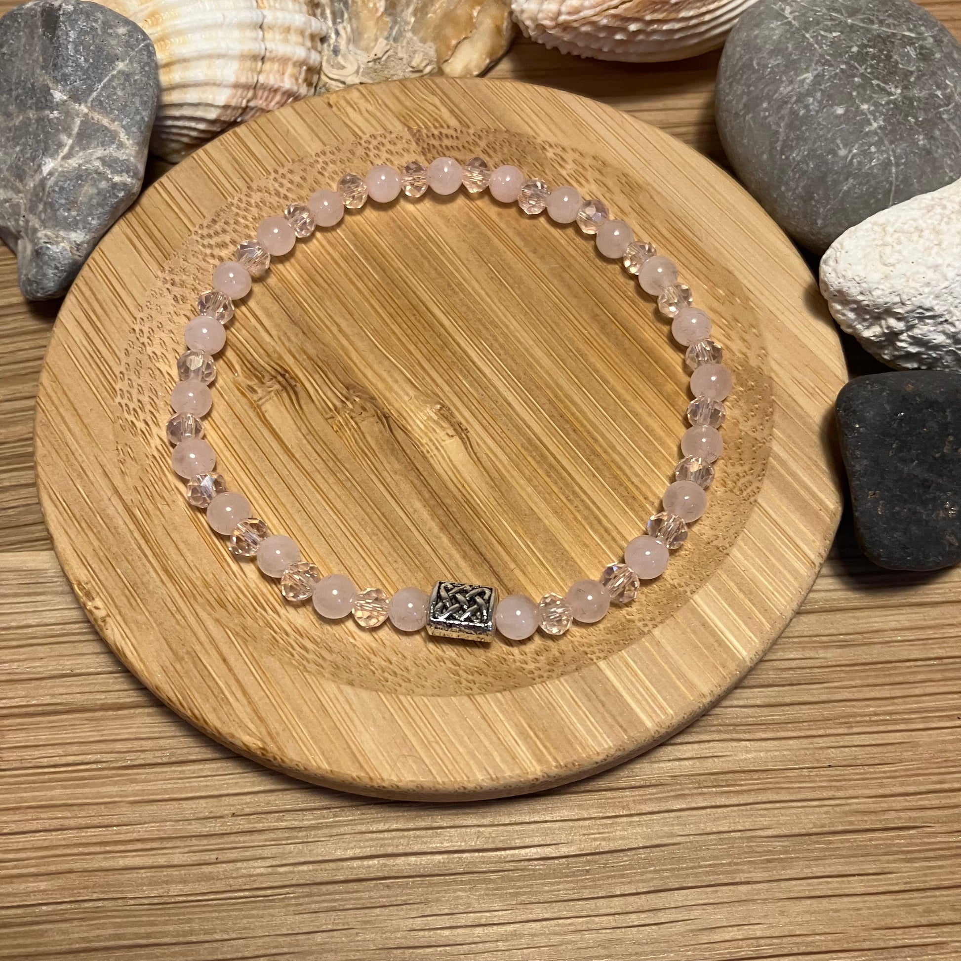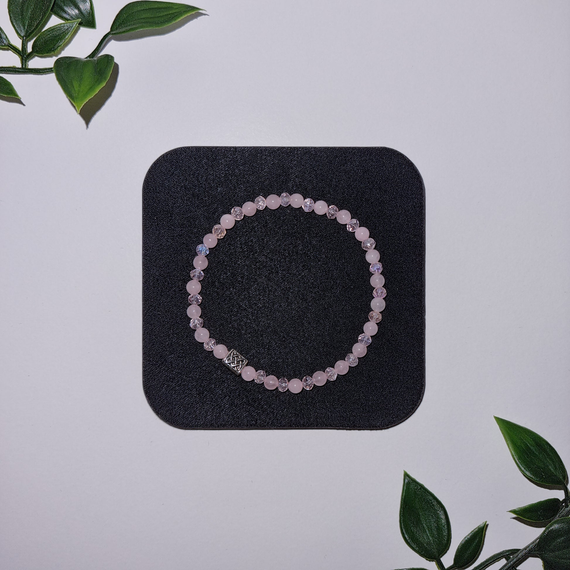 Pink: Very special Rose Quartz stones set off with clear crystals and a sterling silver tibetan friendship charm.