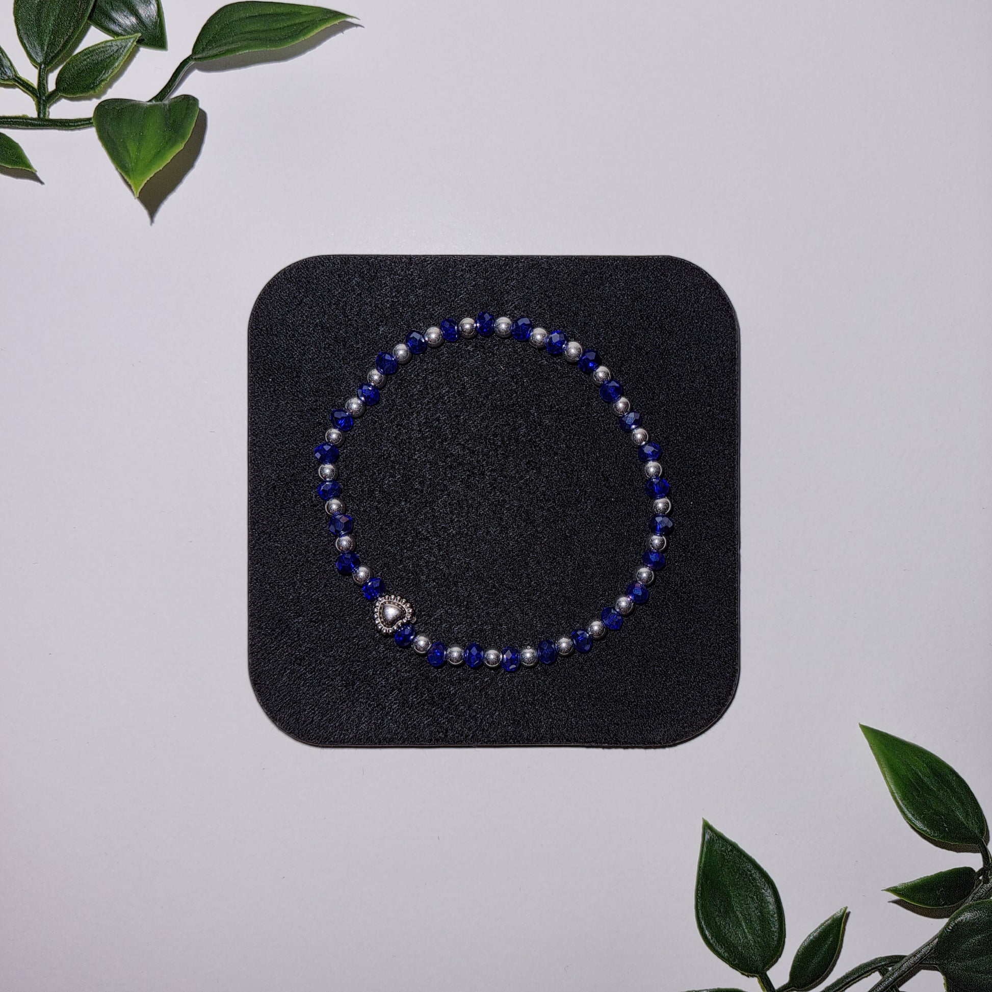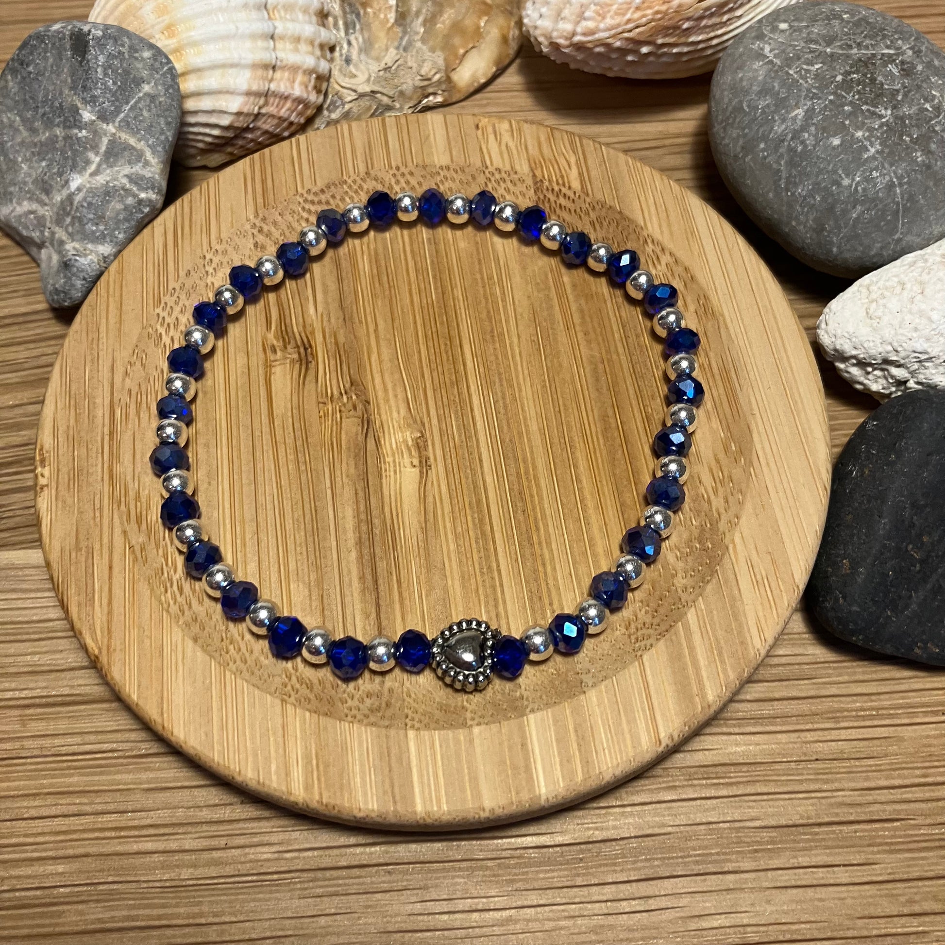 Blue: Stunning deep ocean blue crystals with silver spacer beads and a heart shaped charm.