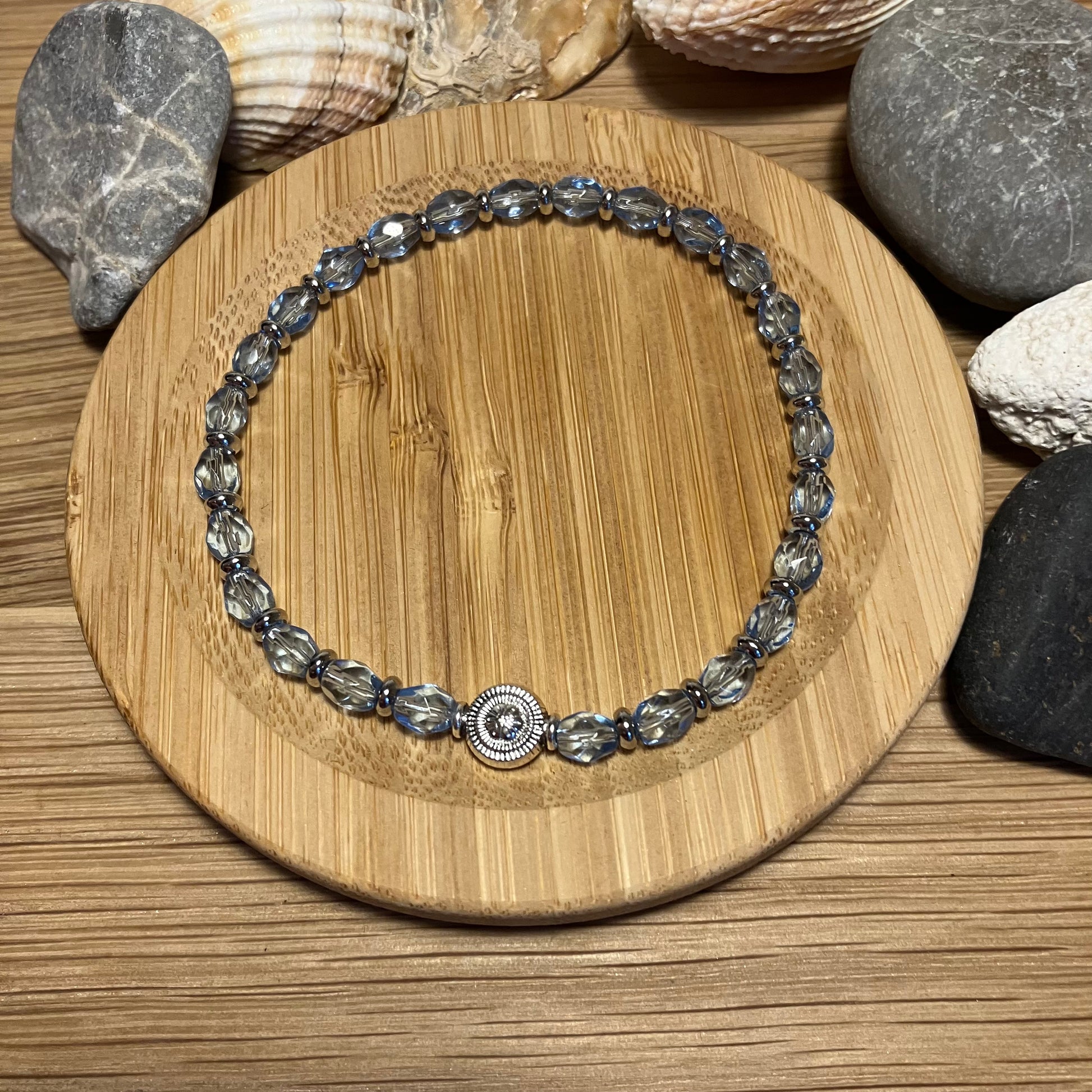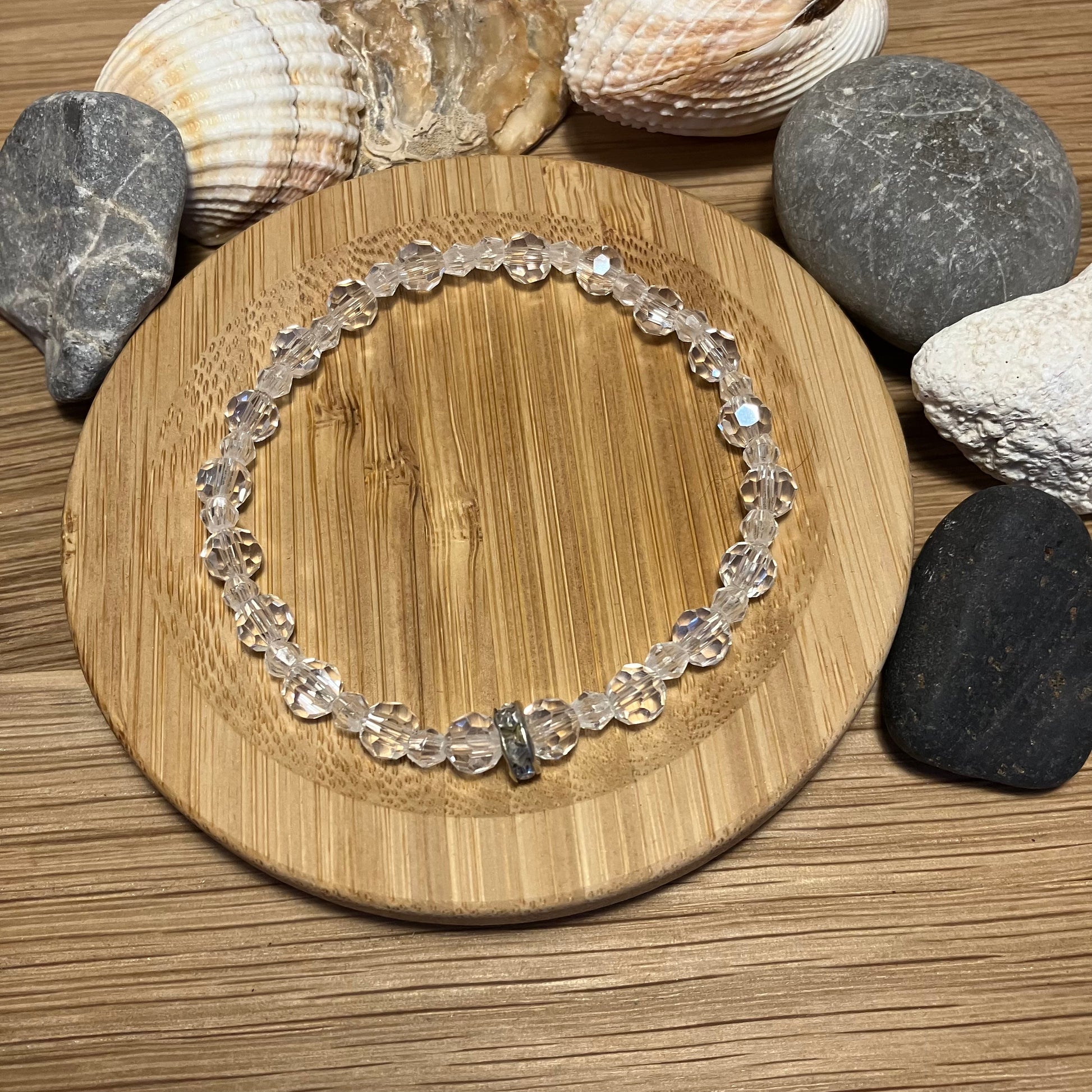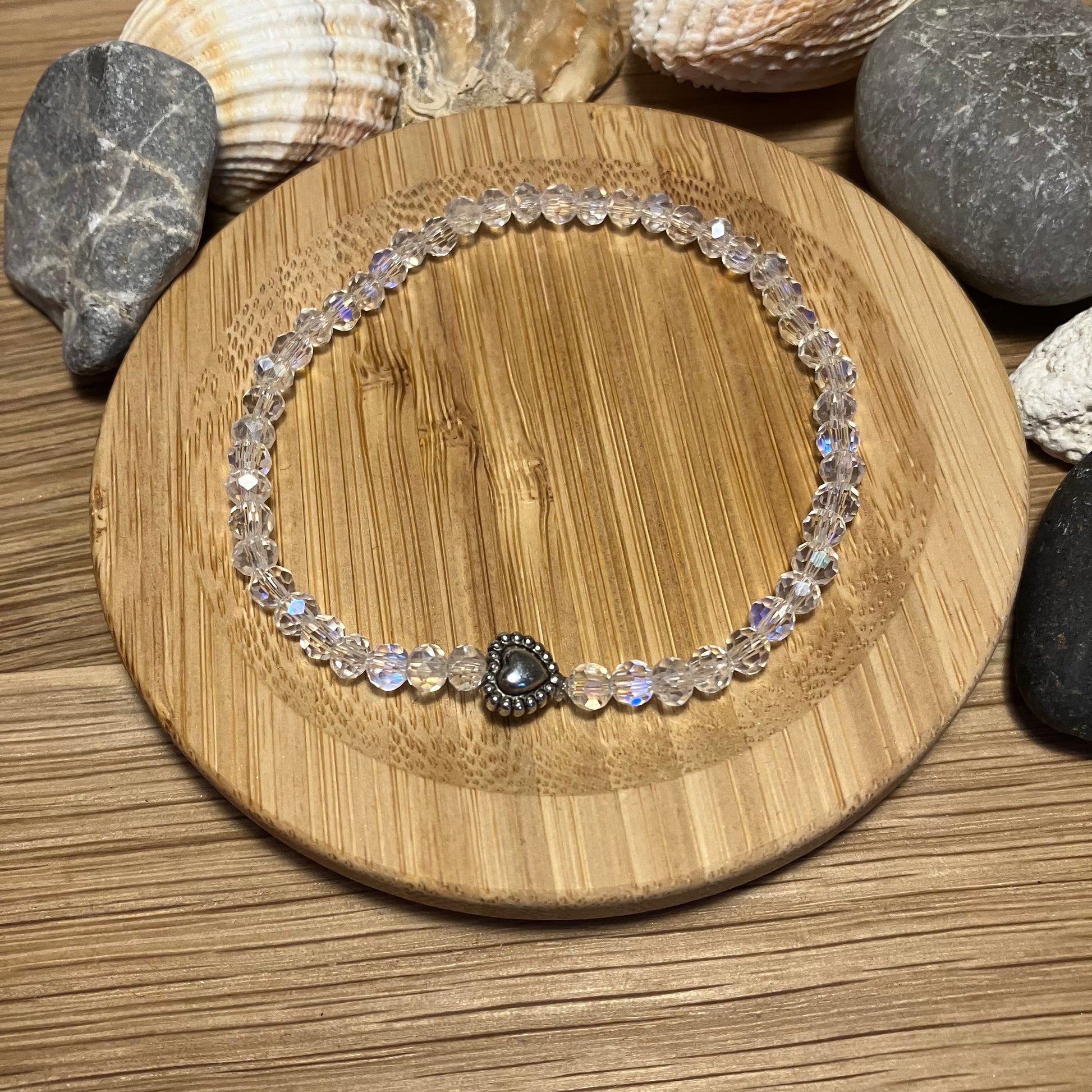 Clear: A bracelet of crystal beads and a heart shaped charm.