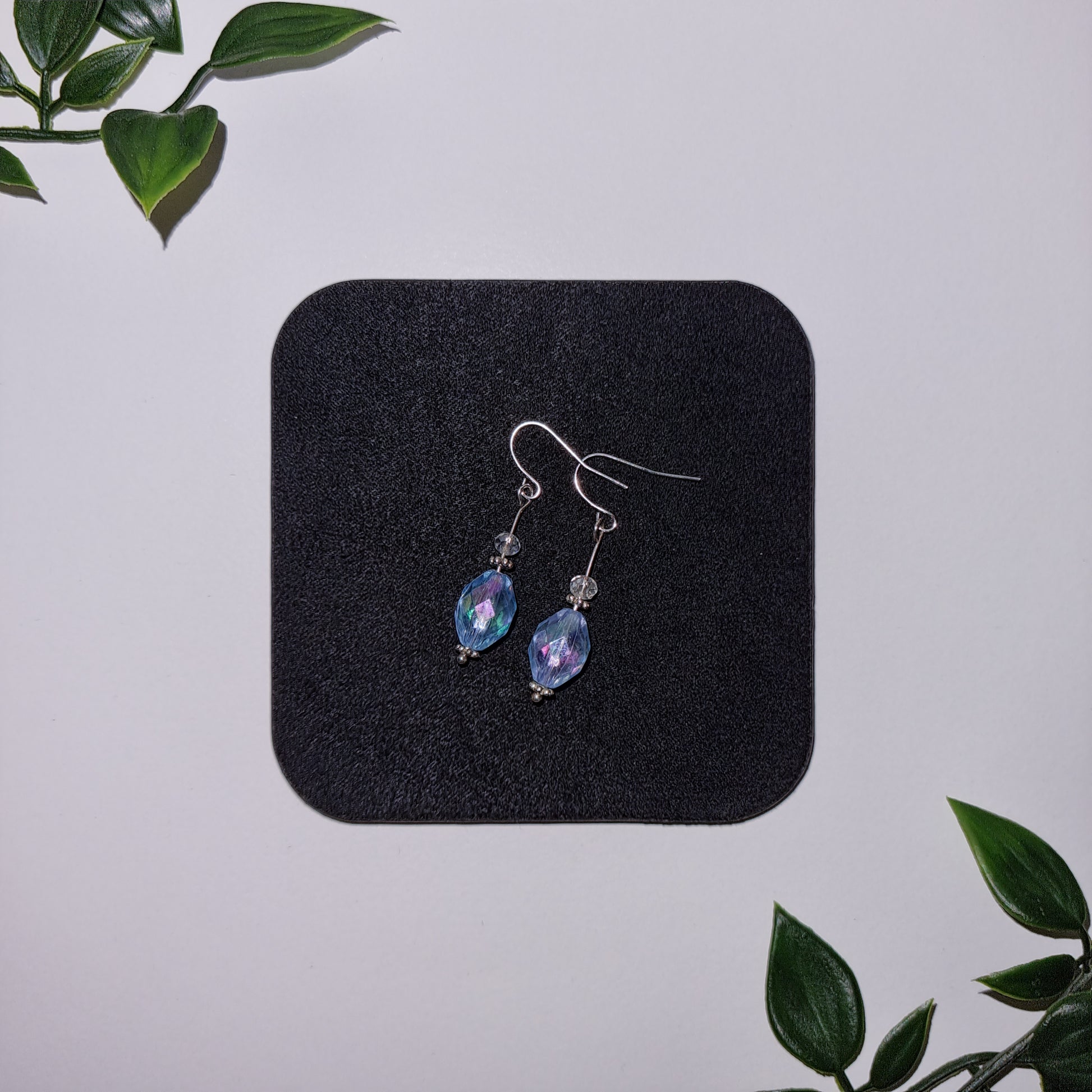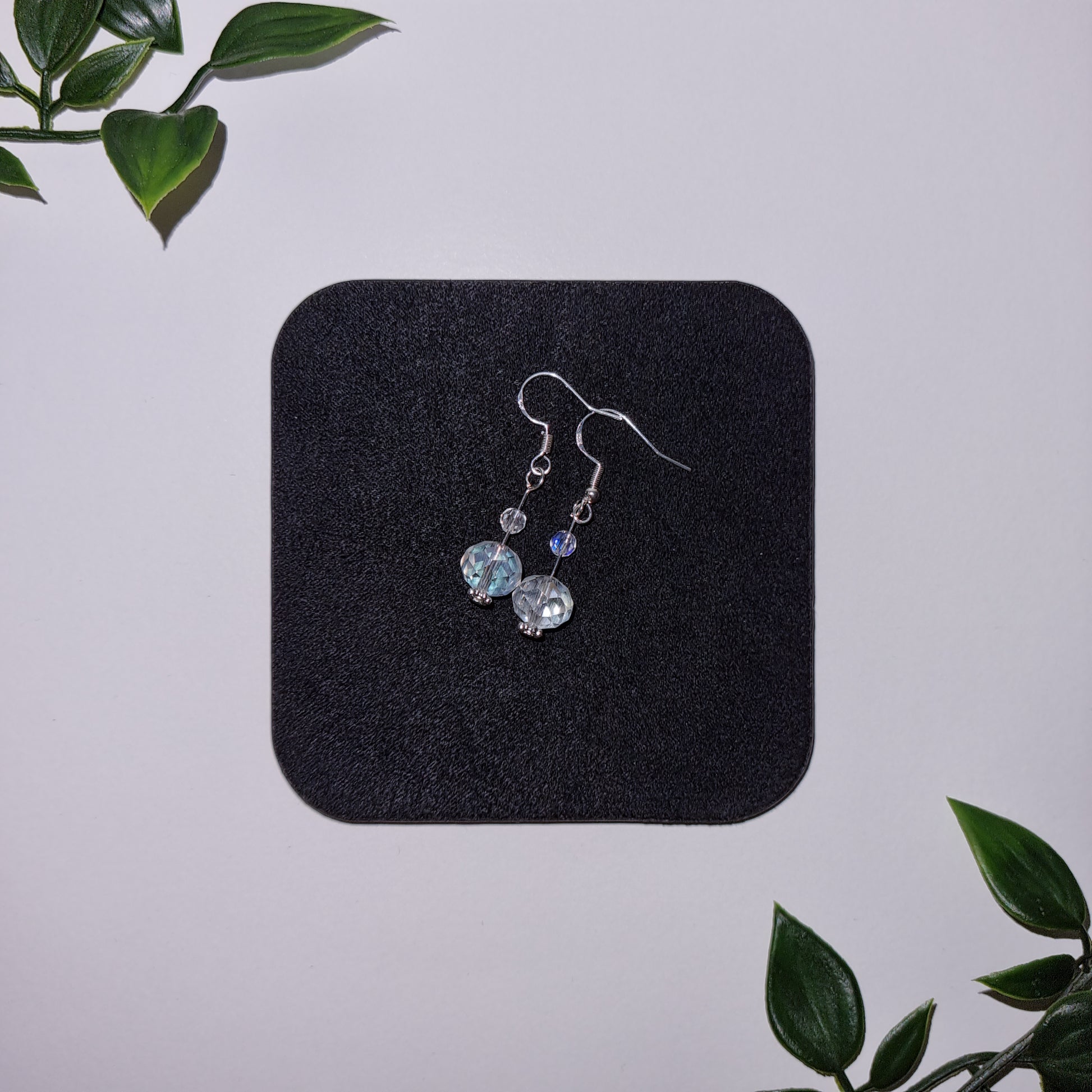 Blue: Oval, pale blue faceted beads topped with a clear crystal rondelle, with two daisy silver beads.